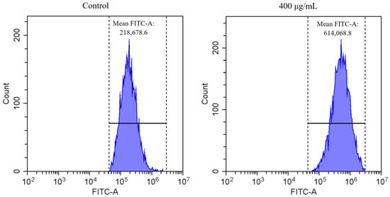 Cellular ROS levels were assessed using the fluorescent probe DCFH-DA []. After 24 h of exposure, DCFH-DA was diluted at a ratio of 1:1000 with serum-free medium, and the diluent was added to label the exposed cells. The cells were maintained at 37 °C in the dark for 30 min. After washing with PBS for 2–3 times, cells were collected and detected by flow cytometry (Beckman, Miami, FL, USA). The wavelength of excitation and emission were 480 nm and 525 nm, respectively.