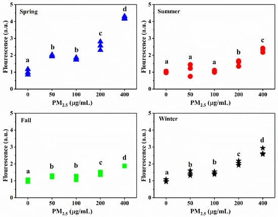 ROS production in all seasons increased with increasing levels of PM2.5, suggesting the toxic effects of the particles. Generally, at lower exposure concentrations (50 and 100 μg/mL), there was no significant difference in ROS production for each season (p > 0.05). At higher exposure concentrations (200 and 400 μg/mL), a significant increase between the concentration treatments was observed. Moreover, the relative amount of ROS in the spring and winter was higher than those in the summer and fall, indicating stronger oxidative damage in these two seasons. Such variations might be related to the differences in PM2.5 composition. Some studies indicated that Zn was the main metal element causing ROS production in A549 cells []; other studies also showed that intracellular ROS production was correlated with the metal components (e.g., Fe, Cr, Mn, Ni, Cu, As, Sr, Cd, Cs, Ba, Pb and Zn) in the particles []. In this study, the highest Zn content was found in the spring, followed by winter, which might partially explain the observed differences. The seasonal variation of the Pb, Co, Cd, Mn, Cr and Cu contents was basically the same as that of the ROS levels. Additionally, the sum of SO42− and NO3− percentages was also higher in the spring and winter, implying their contributions to ROS production [].