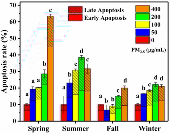 Apoptosis rates in the A549 cells exposed to different concentrations of PM2.5. Early apoptosis is the percentage of cells stained by Annexin V, and late apoptosis is the percentage of cells stained by Annexin V and PI. The total apoptosis rate is the percentage of cells in the early and late stages of apoptosis. Different letters (a, b, c, d) indicate significant differences among the five PM2.5 treatments in each season (p < 0.05). Data are the mean ± SD (n = 3).