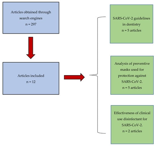 The MeSH terms for the research were: “dental care”, “dentistry”, “dental offices”, “masks”, “coronavirus”, “dental equipment”, and “disinfectants”. Non-MeSH words were “SARS-CoV-2” and “PPE” The following terms were used with Boolean operators to combine searches: “Covid-19” OR “SARS-CoV-2” OR “coronavirus” AND “dental care” OR “dental office” OR “dentistry” with no limitation to the year of publication. In addition, a second search was made: “masks” OR “disinfectants” OR “PPE” OR “dental equipment” AND “Covid-19” OR “coronavirus” OR “SARS-CoV-2”.