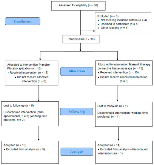 Thirty-six women were recruited for the present study and 36 were assessed for eligibility. Of these, four did not meet the inclusion criteria, one declined to participate, and another did not want to participate for other reasons, leaving 30 participants who were randomly allocated into the manual therapy group (MTG) and placebo group (PG). Over the follow-up period, six participants withdrew from the trial, one from the MTG and five from the PG. Therefore, 24 women were included in the analysis. Both groups of women did not differ on demographic variables. All withdrawals were due to personal reasons (Figure 1).