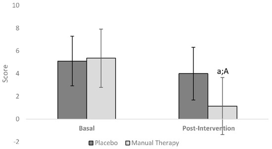 Effect of manual therapy. a: Differences between pre- and post-intervention (p < 0.001) for the pain scale; A: Differences between Placebo and Manual therapy groups (p = 0.044).