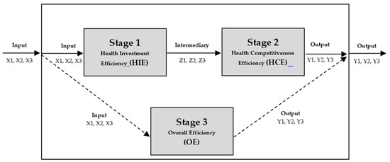 Our study includes the results of efficiency analysis across a total of three routes using the two-stage DEAs. The first analysis was the efficiency analysis for input intermediary, which corresponded to the Health Investment Efficiency (HIE). The input and intermediary were each composed of three variables. The second analysis was intermediary → output, which corresponded to the Health Competitiveness Efficiency (HCE), also each composed of three variables. The third analysis was conducted by the direct route of input → output to see the efficiency result of the overall investment, which was referred to as Overall Efficiency (OE).