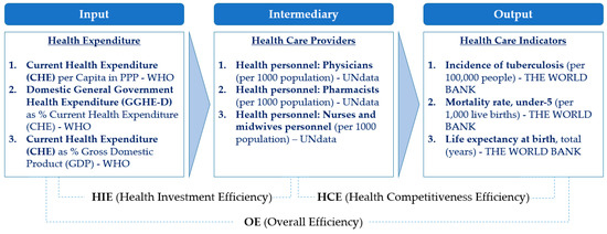 Each variable in the model consists of relevant indicators obtained from public data sources, such as the World Health Organization (WHO), United Nations (UN), and World Bank (WB). In choosing the indicators to reflect the characteristics and efficiency of health and welfare policies in the countries in our sample, we have considered those that are most relevant and available for as many countries as possible. This approach is in line with earlier studies [40,41]. First, “Health Expenditure” indicators for the input variable included “Current Health Expenditure (CHE) per Capita in PPP”, which are most commonly used indicators in the assessment of the health and welfare sector. “Domestic General Government Health Expenditure (GGHE-D) as % of Current Health Expenditure (CHE)” and “Current Health Expenditure (CHE) as % of Gross Domestic Product (GDP)” were also included as measures of the government’s share of public investments in GDP.
