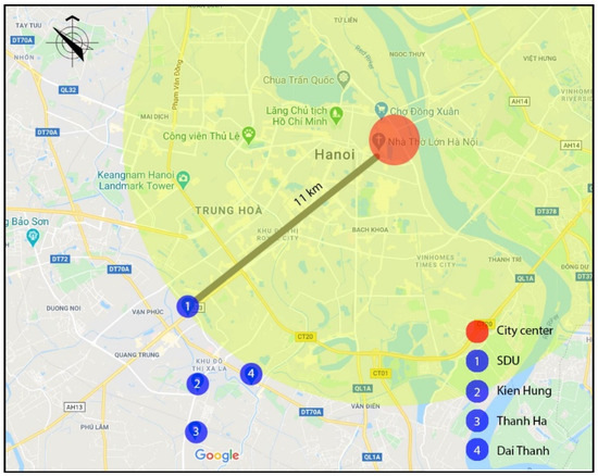 Apartments for low-income people are in great demand in Vietnam’s large cities [58]. In Vietnam, housing for low-income people is recognized as an important component to complement the development of higher productivity jobs in cities, supporting 40% of the population, as well as addressing the national targets for the ongoing rapid urbanization [59]. There are two types of housing for low-income people: social and low-cost housing. Only employees of public institutions (e.g., teachers, soldiers, students, labor workers) who have monthly income less than 350 euro and do not have any house under their homeownership can purchase social housing. Conversely, low-cost housing can be purchased by everyone from private and public institutions. Hanoi is the capital city of Vietnam which is located in the northern region of the country. Its administrative boundaries have expanded since 2008 when the city annexed a neighboring rural province, increasing its size threefold. This expansion has made it the second largest city by population, with approximately eight million people as of 2019 and an area of 3359 km2. To date, more than 150 new urban areas have been developed, 50 of those have been implemented and the remainder are in different phases of planning and construction [60]. Most of the projects are located at a distance of 7–12 km from the city center. Ha Dong, the selected district of this study has been the fastest growing district in Hanoi. It is located on the development axis in the southwest of the city which is approximately 10 km from the city center, and is expected to become a multifunctional sub-center that will reduce pressure on the growing population in the city center. In this district, two social high-rise apartment projects and two low-cost apartment projects were selected. These buildings and neighborhoods were chosen based on their perceived cohesion despite conditions that make it difficult to develop neighborhood ties: large scale, recent development (all buildings and complexes were occupied after 2010), lack of shared open spaces. Location of the four neighborhoods is presented in Figure 1.