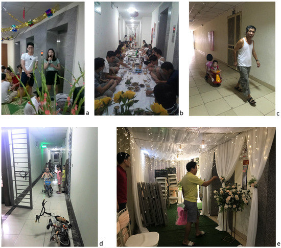 Information was further sought out during on-site visit and discussion on local social media to verify the current situation of residents’ behavior for social interaction in high-rise living environment in Hanoi. Social interactions taking place in the circulation areas are not only greeting or talking, but also important community meetings. Figure 3 shows images of a “corridor party” (a,b: vnexpress, n.d.) [65] and the use of lift lobbies and corridors for different purposes (c, d, e: author, 2019). Many people are in doubt about this spontaneous activity. They consider it as inappropriate in modern life and think it has a negative impact on the safety and privacy of people living in these buildings.