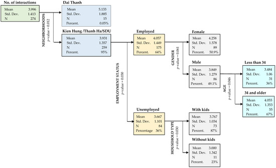 First, the results show a significant split in the number of social interactions in neighborhood 4 (Dai Thanh) compared to the other neighborhoods (p = 0.012). This is probably due to the longest duration of stay, the provision of walkway in the surrounding area and the diversity of services at the ground level in this neighborhood. Next, the most significant difference among residents living in the other neighborhoods is whether people are employed or unemployed, the employed (on average) have 4.06 interactions, while the unemployed have 3.67 social interactions. Subsequently, a remarkable difference can be seen among employed males at different ages. On average, employed males over 34 have 4.06 social interactions and those who are younger than 34 have 3.48 interactions. Among employed residents, females in general have 4.26 social interactions which is relatively higher than an average of 3.85 in males. Within unemployed residents, a remarkable effect of household structure was found. A low number of social interactions (3.00 on average) of unemployed residents was found in families without kids compared to a significant higher number of interactions (3.77) in families with kids. The reason for this may be that unemployment reduces people’s confidence and therefore unemployed residents have a fewer number of interactions with neighbors. However, with the presence of children in their families they are more likely to interact with neighbors, mostly to seek playmates and friendships for their kids.