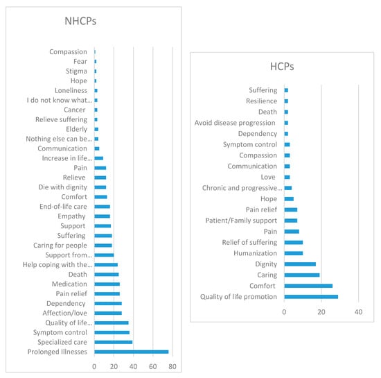 Regarding the terms associated with palliative care (see Figure 1), the term most frequently mentioned by NHCPs was chronic and progressive disease (76). Most of the terms indicated by NHCPs had a positive connotation, for instance, specialized care (39), symptom control (36), quality of life promotion (35), and affection/love (28). Nevertheless, participants associated “nothing else can be done” (4) with palliative care. HCPs used mostly positive terms in association with palliative care: quality of life promotion (29), comfort (26), caring (19), dignity (17), and humanization (10). The terms mentioned by HCPs mostly reflect aspects related to professional clinical practice. We also note the common terms used both by HCPs and NHCPs: quality of life promotion, pain and pain relief, symptom control, communication, love, hope, comfort, dependency, compassion, and dignity.