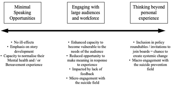 The participants’ narrated experiences informed the results and the conceptualisation of the Continuum of Lived Experience presented in Figure 1. How participants experienced training and speaking activities, how they lived their ongoing lived experience, shapes the national discourse on suicide prevention, and this should be respected. It also became clear that the opportunities to complete training and then go on to do intermittent or one-off speaking engagements offered a chance for people to make meaning from their previous experiences and to understand their own story better. However, inclusion in policy development or on committees or roundtables—where speaking was prolific, and word of mouth spread—created challenges in the practical and emotional costs of speaking. Those who appeared to be impacted heavily by their speaking went on to work more specifically in the macro space of lived experience speaking. Alternatively, some walked away from speaking because of the disorganised space where inclusion of lived experience has been created. Assessment for whom different activities are appropriate, and with what supports in place, is urgently needed