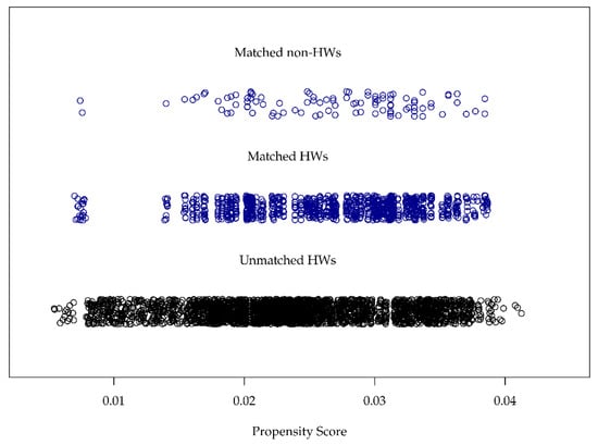The propensity scores (PS) of the populations: at the top, the non-HWs were each matched with 10 suitable HWs. The lower point cloud shows the PS for the unmatched subjects from the HW population.