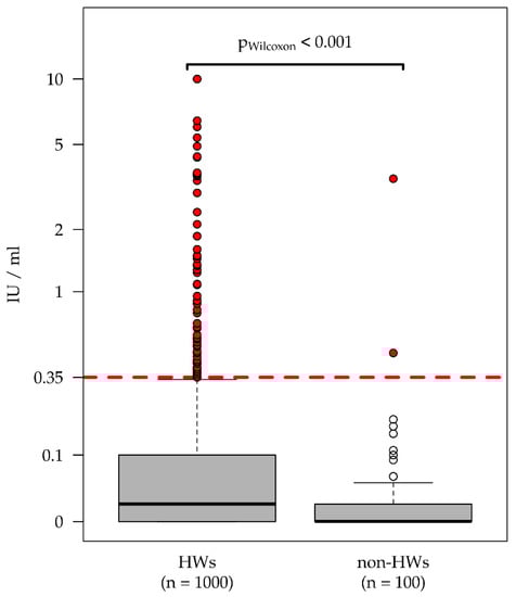 In this study, we found a higher LTBI prevalence among HWs and higher IGRA values where testing was positive. Lower IGRA values, especially test results in the borderline zone up to a level of 0.7 IU/mL, have a higher probability of reversion [].