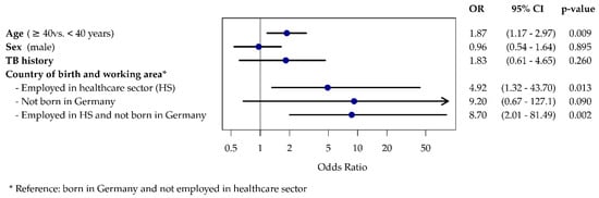 The multivariate analysis, taking into account age groups, gender, TB history, country of birth (Germany vs. not Germany) and employment in the health care sector, gives the following results: we identify an age effect where the risk increases as the age group increases, which is statistically significant (p = 0.009). There is no evident gender effect (p = 0.89). A near doubling of the risk for subjects with a TB history was demonstrated, and there was an effect from both country of birth (OR = 9.2; 95% CI: 0.67 to 127.1; p = 0.090) and from employment in the health care sector (OR = 4.9; 95% CI: (1.32 to 43.7); p = 0.013). However, the latter two effects combined with each other do not have a multiplicative effect, but result in an OR of 8.7 (95% CI: 2.0 to 81.5; p = 0.002) (Figure 3) when interacting with one another.