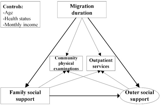 Outer social support has a mediating effect on the relationship between migrating duration and the use of health services.