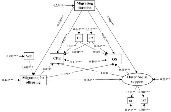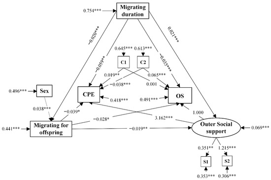 Based on the empirical research in SEM, at least one path should be referred and its coefficient should be set as 1 when the latent variable is measured by multiple observable variables [27]. Thus, to estimate the effect of outer social support on the use of CPE, the coefficient of the path from outer social support to OS was set as 1. Conversely, the coefficient of the path from outer social support to CPE was set as 1 to estimate the effect of outer social support on the use of OS. The fit indices of both models were the same and are shown in Table 4. In comparison to the previously recommended values [25,27], the χ2/df (5.913) in this study was slightly greater than 3 due to the large sample size’s (N = 11,161) sensitivity, whereas the other indices indicated that the model was acceptable with the comparison of the empirical data.