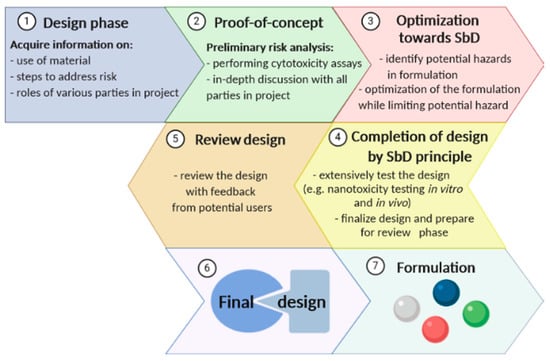 - Kraegeloh, A.; Suarez-Merino, B.; Sluijters, T.; Micheletti, C. Implementation of safe-by-design for nanomaterial development and safe innovation: Why we need a comprehensive approach. Nanomaterials 2018, 8, 239. [Google Scholar] [CrossRef]