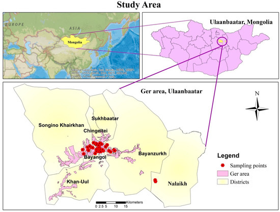 Location of sampling points in the ger district, Ulaanbaatar, Mongolia.