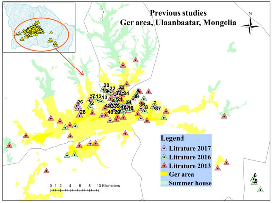 Although a number of studies have been performed to identify the concentration of heavy metals in soil samples as mentioned in the introduction, three main studies were selected in the present study as most of soil samples in these three studies [6,14,15] were collected from the ger area of Ulaanbaatar city and showed a high concentration of heavy metals. In these studies, there were 119 soil samples in total, as illustrated in Figure 2.