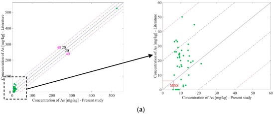 Arsenic (As): Measurement result of element arsenic (As) in the present study is illustrated in Figure 3a and the measurement data were compared with previous literature and the MNS values. In Figure 3a, the horizontal and vertical axes represent the concentration measured by the present and literature studies, respectively. The red line represents the Mongolian National Standard. If concentration values exist inside the red lines, it means that the concentration is under the standard value. The measurement results of the present study revealed that all samples exceeded the MNS value for the present and previous literature. In Figure 3a, the dotted black (20 mg/kg) and pink (40 mg/kg) lines represent the deviation from the centerline where two measurement values are equal. The difference between the present and literature data for As was under 40 mg/kg, as illustrated in Figure 3a. The measured concentration of arsenic (As) in sample No 6 was extremely high when compared with the other samples in both the previous literature and present studies. The sample No 6 was taken from a waste area of the old glass factory that is in the ger area of the Nalaikh district, Ulaanbaatar, Mongolia. The glass is made of a molten mixture of heavy metals including As. Therefore, the concentration of As in the sample No 6 might be measured as extremely high (526 mg/kg of As).
