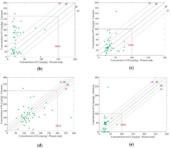 Cadmium (Cd): Although Cd was identified in the present study, there were only measurement data for samples No. 38, No. 41, and No. 42 in the previous literature. Therefore, the comparison was made at only those points. However, measurement data of the previous and present studies did not exceed the MNS value and there were no significant differences.