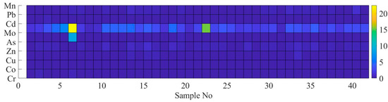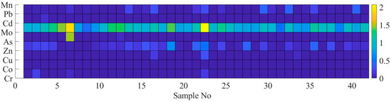 where Cn is the measured concentration of element n = 6; Bn denotes the value of the background concentration; these values were selected from [23]. Cr = 45, Co = 18, Cu = 25, As = 12, Cd = 1.0, Pb=20, Mo = 1.9, Mn = 710, and Zn = 60.