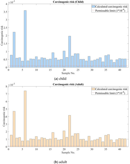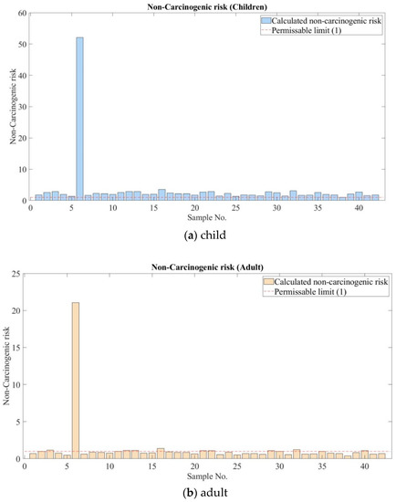 Used equations for noncarcinogenic and carcinogenic risks are shown in Equations (6) and (7) and Equations (8), respectively. The non-carcinogenic risk for a single heavy metal was determined as the hazard quotient (HQ). To find out the total cancer risk, according to Equation (8), the estimated risk caused by every heavy metal for the three pathways were added. In the present study, an permissible limit for the HI was set as 1, while the permissible limit for CR was set as 10−4 [28].