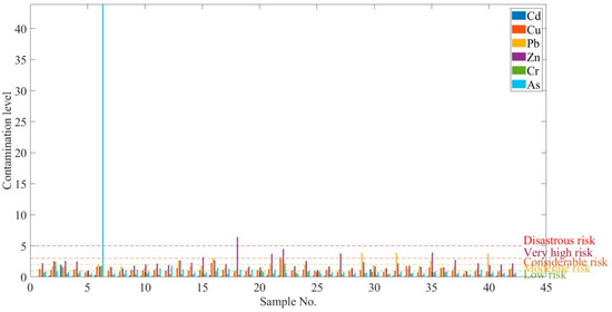 By using the information on the contamination index, the potential ecological risk index of a single element can be calculated by Equation (10):