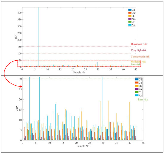 TRF-Pb = 5, Cd = 30, As = 10, Cu = 5, Zn = 1 [36], and Cr = 2 [37]. Finally, comprehensive potential ecological risk () was estimated by Equation (11):