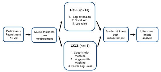 The study design is presented in Figure 1. All participants visited the laboratory for a day during the period of the study. Before the exercises, the thickness of the quadriceps muscles was measured using a portable B-mode ultrasound device (Healcerion, Seoul, Korea) with a linear-array transducer (7.5 MHz). The ultrasound device was set for gain (dB), depth (5 cm), and frequency (12 MHz) for all images. Each participant in the OKCE and CKCE groups performed three exercises and the thickness of their quadriceps muscles was measured in the same position immediately after the exercises.