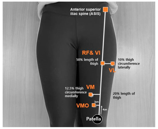 Ultrasound images were obtained using a portable ultrasonic imaging device and a portable tablet personal computer (IPad, Foxconn, Taipei, Taiwan). All muscle thickness measurements were performed by one investigator. Previous investigations reported excellent intra-rater (Intraclass Correlation Coefficients (ICCs) 0.95–0.97) and acceptably good inter-rater (ICCs 0.62–0.90) reliability of the quadriceps thickness measurements using ultrasound [20,21]. To measure the thickness of each quadricep muscle, the participants were made to lie in a supine position to prevent external hip rotation. The leg of the participants that was farthest away from the ball was considered the dominant leg [22]. The dominant leg of the participants was assessed after the participants were made to lie in a supine position with both legs fully extended for 10 min to stabilize the fluid shifts [23]. A water-soluble gel that was applied between the transducer and skin enhanced the acoustic contact and reduced the risk of image misinterpretation [24]. The transversal images of the quadriceps muscles were acquired in the sequence RF, VI, VL, VM, and VMO. To obtain the images, a virtual line was marked along the length of the thigh from the superior pole of the patella to the anterior superior iliac spine (ASIS). The RF and VI were measured on and at 50% of the virtual line. In order to measure VL, thigh circumference at 50% of the virtual line was measured, and then VL was measured as 10% of the measured circumference distance laterally from the virtual line. The VM muscle was measured at 20% distance of the virtual line, and then the circumference was measured on the same point. Once the measurement of the circumference was completed, VM was measured at 12.5% of the measured circumference distance medially from the virtual line [25]. The VMO muscle was measured 4 cm superior and 3 cm medial of the superior pole of the patella (Figure 2) [26]. The gain was adjusted until the femur was in the center of the screen such that the boundary of the muscle was visible, and then the depth of the image was measured. Images of each muscle were recorded three times. The ultrasound images were saved for further analysis after the muscle thickness was measured.