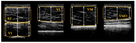 The quadriceps femoris muscle belongs to the primary muscle group that is involved in the function of the knee joint. Various sports injuries could result in altered quadriceps characteristics, such as muscle strength, activation, mass, and size of the quadriceps [1,2,3,4]. Previous studies have reported weakness and atrophy of quadriceps muscles after knee joint injuries [2,5]. Recovery of these muscles to their pre-injury state is needed to restore the function of the knee joint [6,7,8]. The quadriceps femoris muscle is made up of five specific muscles—the rectus femoris (RF), vastus intermedius (VI), vastus lateralis (VL), vastus medialis (VM), and vastus medialis oblique (VMO). Although this group of muscles normally functions as a knee extensor, previous studies have reported a specific function of each muscle component. The RF is a biarticular muscle that connects the hip joint to the knee joint and acts as a primary knee muscle extensor; 33% force is exerted while bending the hip joint [9]. The VM is a primary knee extensor muscle, and the VMO muscle acts as a medial stabilizer of the patella [10]. Although the VMO muscle is weaker than the VL muscle, it controls the lateral deviation of the patella [11,12]. The imbalance of forces between the VM and VL muscles results in patellar instability, causing movement dysfunction and inducing patella femoral pain syndrome (PFPS) [13]. Each quadriceps muscle has a specific role in movement; hence, it is necessary to investigate the characteristic of each quadricep muscle for functional improvement.