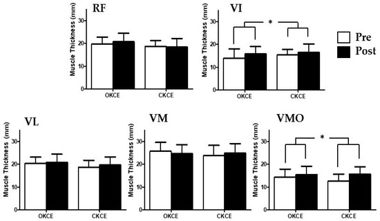 Comparison of the changes in quadricep muscle thickness. OKCE: open kinetic chain exercise, CKCE: closed kinetic chain exercise, RF: rectus femoris; VI: vastus intermedius; VL: vastus lateralis; VM: vastus medialis; VMO: vastus medialis oblique. * p < 0.05 indicates a significant difference between pre- and post-intervention within the group.