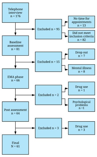 Once participants declared their interest via email, they were called and interviewed regarding the inclusion criteria mentioned above. A total of 176 participants underwent the telephone interview. Ninety-five participants were excluded from further assessments because they had no time for appointments or did not meet the inclusion criteria of the study. A total of 81 participants fulfilled the inclusion criteria of the study and were invited for further testing.