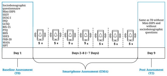 The post (T2) assessment took place no longer than seven days after the EMA at the Department for Clinical Psychology at the Institute of Psychology at the University of Duisburg-Essen and lasted approximately one hour. The post (T2) assessment was identical to the baseline (T0) assessment, except that participants did not have to complete the Mini-DIPS and the sociodemographic questionnaire.
