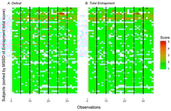 Heatmaps for momentary ratings of defeat and entrapment across observations and participants. Ratings of momentary defeat and entrapment are coded by color. Green symbolizes low momentary ratings and red symbolizes high momentary ratings of the construct. Missings are coded white. In each heatmap, one row represents one participant and one square represents one momentary rating. On the x-axis, vertical lines separate the days of the assessments (days 1–7). Additionally, numbers in steps of ten (0, 10, 20, 30) indicate the number of assessments (total 35 assessments). On the y-axis, participants are sorted by their MSSD score of total entrapment (participants with high entrapment MSSD scores are represented in the upper portion of the heatmap and participants with low entrapment MSSD scores are represented in the lower portion of the heatmap). Momentary ratings of the represented variables vary within participants and across time, as is pictured here. Overall, the lower part of the heatmap is dominated by green, and red shades are mostly missing, meaning missing or very low levels of defeat and entrapment for many participants.