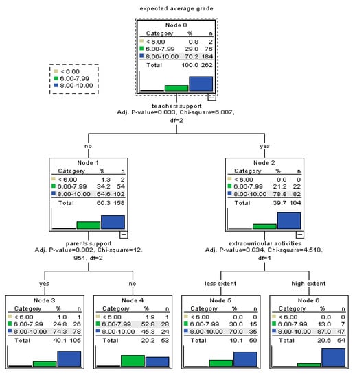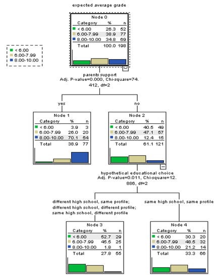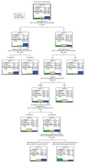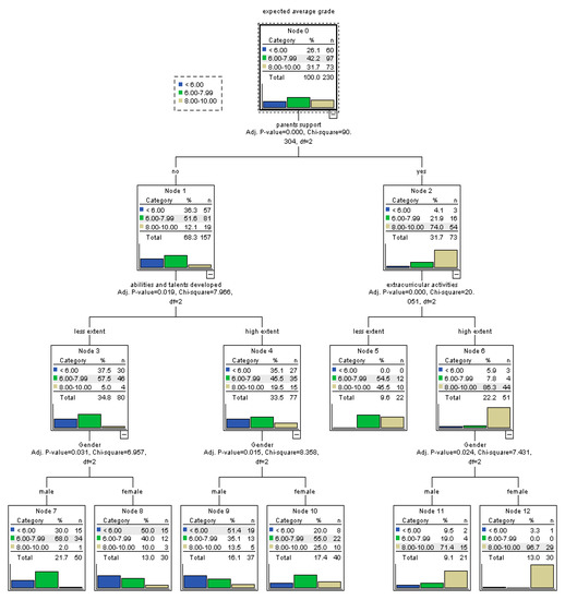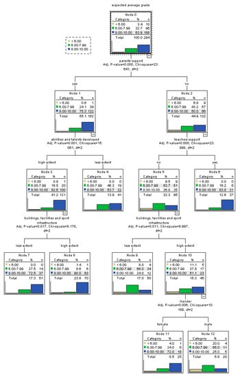 In order to shed light on the main factors predicting perceived academic self-efficacy, we employed decision tree models that are able to unveil patterns in data, producing tree-based classification models that group students based on a set of factors with respect of their likelihood to belong to one of the classes of the dependent variable [50,51]. Tree-based algorithms are very powerful predictive models with high performances of accuracy, stability, and ease of interpretation. They are highly performant for complex, non-linear relationships in data. Moreover, the tree-based models are ideal for capturing interactions between independent variables. Outputs of tree-based classification models highlight groups and sub-groups of homogenous cases that are called parent and child nodes of the tree. The model predicts the most commonly occurring class in each node (sub-group of cases). So, one of the main advantages of tree-based models relies on the fact that they allow for identification of distinct sub-groups of cases based on the interaction of significant independent variables for which predicted values are calculated. Moreover, in the case of tree-based models, one independent variable might be used for more than one split of the tree or not at all, which allows the identification of complex interaction relations. For the development of the decision tree models, we used the Chi-squared automatic interaction detection (CHAID) growing method. In each step of the growing tree, the model identifies the independent variable that has the strongest interaction with the dependent one. Significance level for splitting nodes in the models has been of 0.05. Also, in the case of categorical independent variables, the model can merge categories that have a similar pattern of association with the dependent variable.