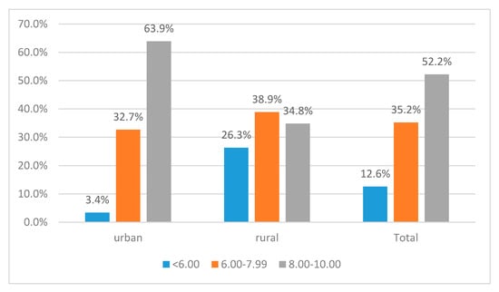 Perceived self-efficacy varies significantly by area of residence (Figure 2). The significance of the relation has been confirmed by the chi-square test (p = 0.000). Failure beliefs are significantly more prevalent in rural areas as 26.3% of rural students do not feel able to obtain a final grade above 6.00 at the baccalaureate exam, as compared with 3.4% in urban areas. Also, urban areas register a significantly higher concentration of those with high self-efficacy (63.9%) than rural areas (34.8%). Taking this result into account, we constructed different tree-based models for urban and rural students.