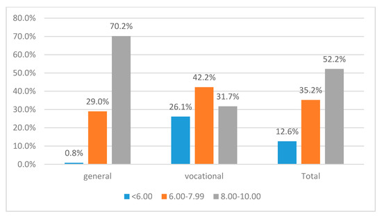 On the other hand, our results show that there is a significant association between perceived self-efficacy and the type of educational track (p = 0.000). Students enrolled in general education have more efficacious beliefs, while students enrolled in vocational education display lower levels of self-efficacy (Figure 5).