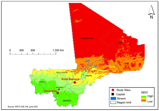 Study sites: shapefiles have been obtained from the Mission of Decentralization and Institutional Reform of Mali (MDRI). The map was based on the cartography of Mali, the mean Normalized Difference Vegetation Index (NDVI) reported downloaded as rasters from the National Aeronautics and Space Administration (NASA) Giovanni on a time period going from 22 June 2015 to 6 January 2017.