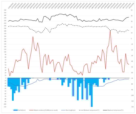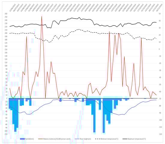 To assess the relationship between environmental, meteorological, and hydrological components and the incidence of malaria at the different sites, the same analytical approaches were applied for the Dangassa and Koila study sites. Epidemiological data (number of malaria cases), hydrological data (river height), and meteorological and environmental data (temperature, humidity, vegetation index, wind speed, rainfall) were aggregated from a daily to weekly basis, except for NDVI data, which was captured on a monthly basis (EOSDIS information system). New variables were generated on the basis of the values of weekly primitive variables. Summary measures included weekly minimum values, maximal values, mean values, interquartile intervals of observed weekly values, cumulative values for precipitation and weekly number of rain events based on weekly rainfall values [10,12].