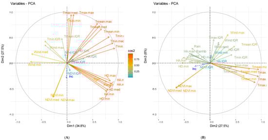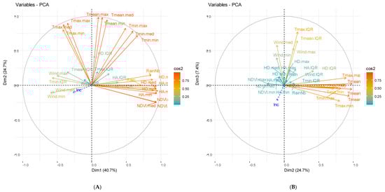 The combination of meteorological and vegetation components has made it possible to identify three major components (derived from the PCA), accounting for 72.80% and 70.30% of total inertia for Dangassa and Koila, respectively (Figure 4A,B and Figure 5A,B). The composition of the PCA derived axis was variable across study sites. For the Dangassa group, the first components (Dmt1, 40.70% of the inertia) consisted mainly of humidity, vegetation, rain, and temperature, in opposition to the wind speed and the variation of temperatures. The second component (Dmt2, 24.70% of the inertia) was constituted mainly of temperature. The third component (Dmt3, 7.40% of the inertia) consisted of the wind speed and the variation of temperatures.
