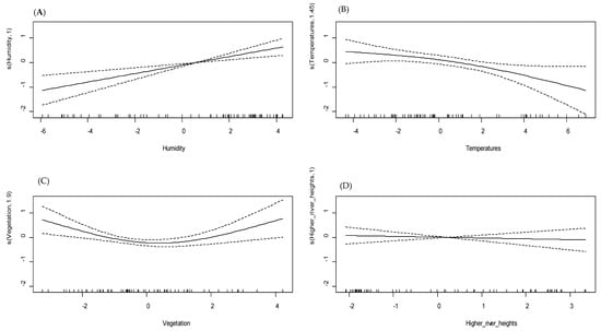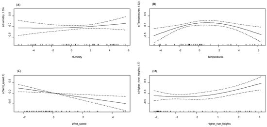 Relationship between meteorological and hydrological components (multivariate GAM model), Dangassa. (A) Humidity (Dmt1); (B) temperatures (Dmt2); (C) wind speed (Dmt3); (D) higher river heights (Dhriv1).