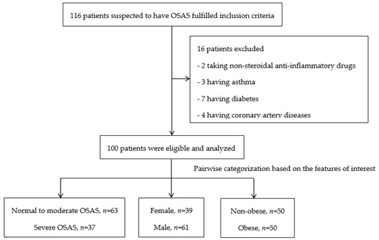 In this study, three bisected categorical predictors were required when performing the three-way interaction analysis. Therefore, the participants were categorized into three paired study groups based on the three features of interest (the severity of OSAS, sex, and obesity): normal to moderate OSAS group versus severe OSAS group, female group versus male group, and non-obese group versus obese group. Severe OSAS and obesity were defined as an AHI ≥ 30 events per hour and BMI ≥ 27 kg/m2, respectively, based on public health implications and different BMI cut-off points for obesity in different ethnic groups [13,27,28,29]. Otherwise, the patients were defined as having normal to moderate OSAS and being non-obese, respectively. All data were expressed as mean and standard deviation for continuous variables or a number (percentage) for categorical variables. Comparisons were made using the independent t-test for continuous variables based on the normality test where log10 transformation was performed when variables were non-parametric distribution and the chi-square test for categorical variables between the paired study groups. All of the available data were analyzed in cases where some data were missing. Three-way interaction analysis was used to determine the interaction effects of OSAS severity, sex, and obesity on the three studied inflammatory biomarkers (CRP, IL-6, and TNF-α). If there was no significant interaction among the three factors on the inflammatory biomarkers, then the simple main effect was analyzed between any two factors. In addition, the main effects were analyzed if there was no significance in the simple main effects. One-way analysis of variance (ANOVA) was used to validate differences if they were significant in the three-way interaction analysis. Post hoc statistical power was calculated using G-Power 3.1(Heinrich-Heine-Universität, Düsseldorf, Germany) for the significant findings using the criterion for significance (alpha) at 0.05. The statistical analyses were performed using Predictive Analysis Software (PASW) version 18.0 (SPSS Inc., Chicago, IL, USA). Significance was set at p < 0.05.