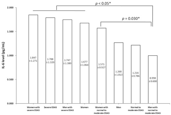 The validation results of the interaction effects between OSAS severity and sex on the level of IL-6. All data are expressed as mean and standard deviation at a significant difference with a p-value <0.05 (*). Abbreviations: IL-6, interleukin-6; OSAS, obstructive sleep apnea syndrome.