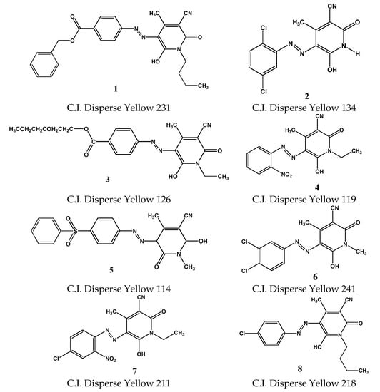 It is of value to mention here that pyridione derivatives have largely supplanted anthraquinones as disperse dyes with desirable properties. Among these dyes compounds 1–8 are commercially accessible (Figure 1) [6,7,8]. Azo pyridone dyes are significant pyridone derivatives that have to a great extent replaced disperse dyes based on pyrazolones due to their excellent hues.