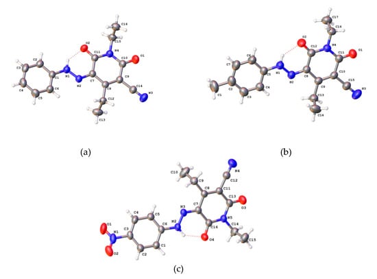 ORTEP structures of (a) dye 14q; (b) dye 14r and (c) dye 14w.