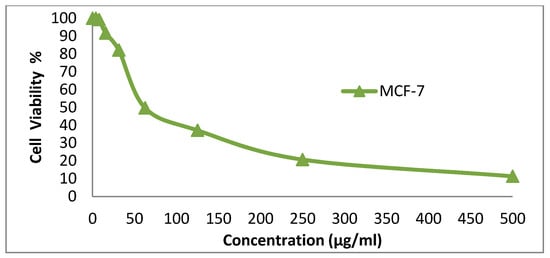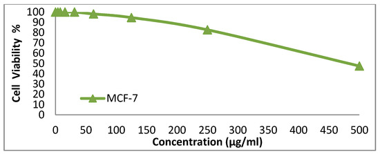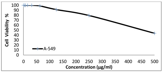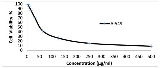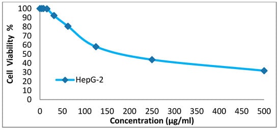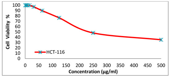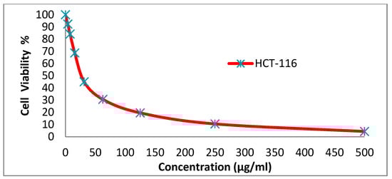 We tested the anticancer activity of the dyes 14x and 14y against the HepG-2, HCT-116, A-549 and MCF-7cell lines. Various concentrations of disperse dye 14x and disperse dye 14y were utilized for evaluating the IC50 (µg/mL). Figure 3, Figure 4, Figure 5, Figure 6, Figure 7, Figure 8, Figure 9 and Figure 10 show that dye 14x had strong activity 23.4 (HepG-2), 62.2 (HCT-116), 28 (A-549) and 53.6 (MCF-7) µg/mL, respectively, while dye 14y revealed weak action 196 (HepG-2), 482 (HCT-116), 242 (A-549) and 456 (MCF-7) µg/mL, respectively [30].