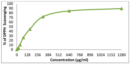 We evaluated the antioxidant properties of the two dispersant dyes prepared by us in an easy and effective way in vitro by their 2,2-diphenyl-1-picrylhydrazyl (DPPH) free radicals scavenging activity. Figure 11 and Figure 12 demonstrate the good antioxidant activity of the dispersant dye 14x, with IC50 of 64.5 (more than ascorbic acid used as a standard, with an IC50 of 14.2), while the disperse dye 14y had weak antioxidant activity (IC50 191.6) [30].