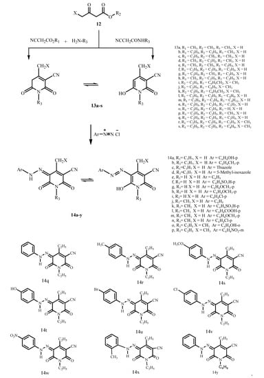 Pyridone derivatives have found wide application in the synthesis of azo dyes, particularly as disperse dyes [12,13,14,15,16,17,18,19,20]. An example of this the work of Balalaie et al. [21,22,23] who have announced an effective three component condensation of alkyl cyanoacetates, primary amines, and β-ketoesters affording more significant yields of 13a–h. These compounds have two tautomeric structures, and in solution there is a quick equilibration between them. Pyridones 13a–s could be promptly coupled with heteroaromatic diazonium salts producing the comparable heteroaromatic azopyridones dyes (Scheme 2).