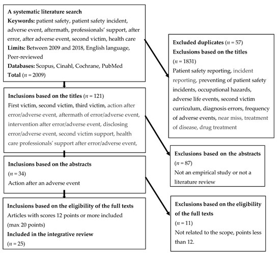 The databases Scopus, CINAHL, Cochrane and PubMed were searched for relevant articles. Boolean search methods were used to retrieve articles related to action after adverse events in healthcare such follows: “adverse event” AND “disclosure” OR “aftermath”, “adverse event” AND “professional’ support”, “healthcare” AND “second victim”, “healthcare” AND “after error”.
