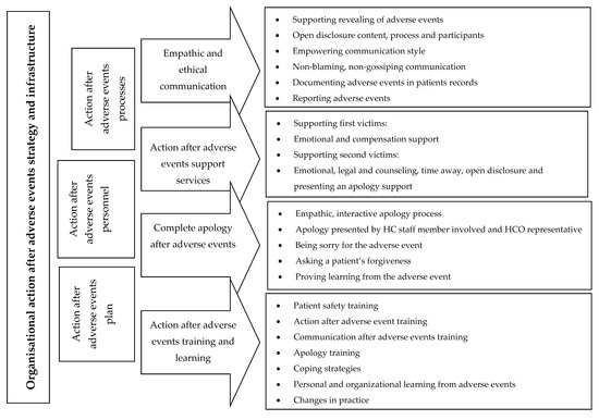 The action for the third victims theme consisted of organisational strategy and infrastructure [20,46,49], which was divided into action after adverse events plan [12,25,52], personnel [36,37,42,46,52] and processes [20,36,52] subthemes (Figure 2). The key elements of the subthemes were: